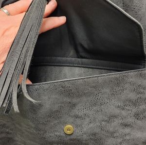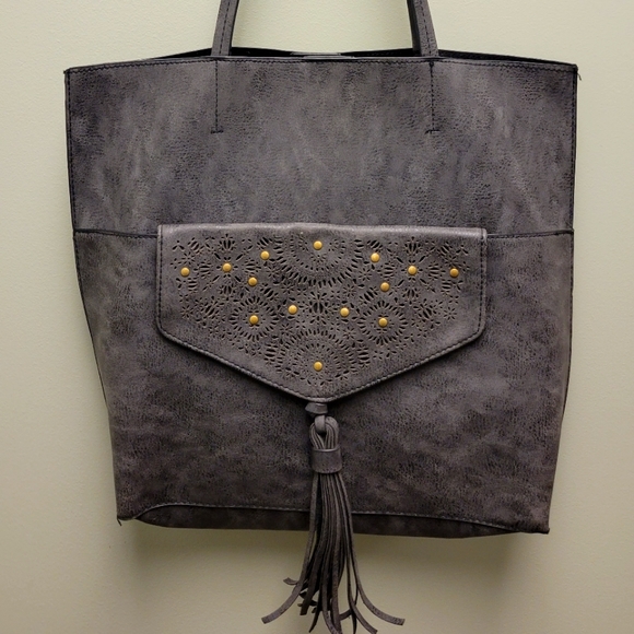 Non-brand bag for sell. Soft, grey material. As you can see, she is very stylish. There are no pockets inside, and only the one pocket on the front of the bag!