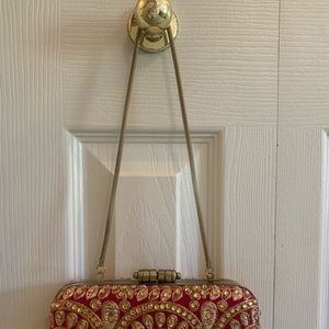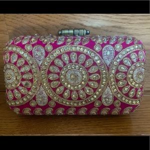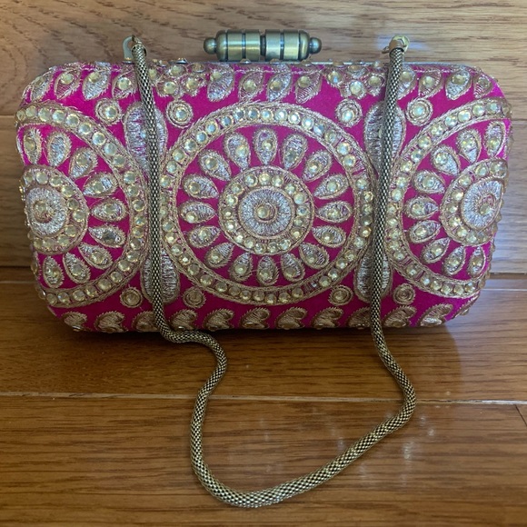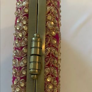 Small purse/clutch that can be used with the short chain strap. Large enough to fit cell phone, small wallet, lipstick/liggloss, compact. BRAND NEW, never used. Dark pink/fuschia color with gold-bronze thread work and sequins all over. Beautiful clutch for a party or night out! Make me an offer!