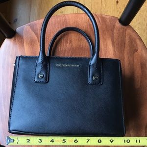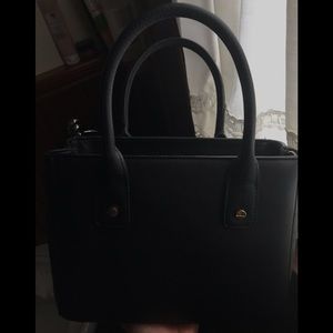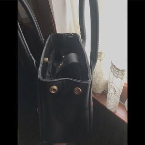This modern and stiff black purse is handheld. Never been used. In perfect condition, used ONCE when I went out. The material is water-proof. Above I have included pictures of the measurements for length,height(with straps), and width.