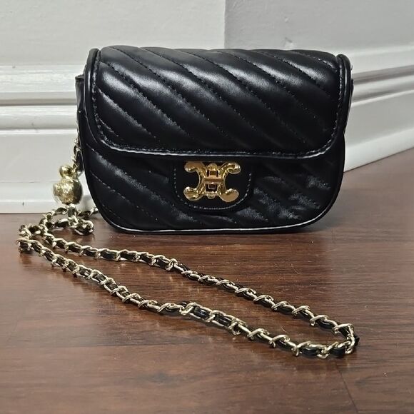 The PurseN mini bag in black and gold is a chic accessory featuring a diagonal quilted pattern and a gold-toned chain strap. Its compact design is perfect for adding a touch of elegance to any outfit, with a secure flap closure and decorative gold hardware.