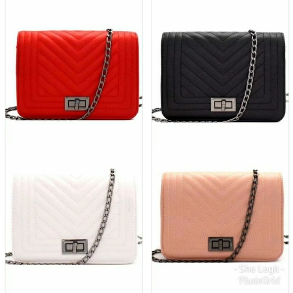 Faux leather, chain shoulder strap, hematite-tone hardware, interior zipper and pocket, flap with turn-lock closure. 8x3.5x6