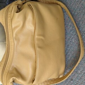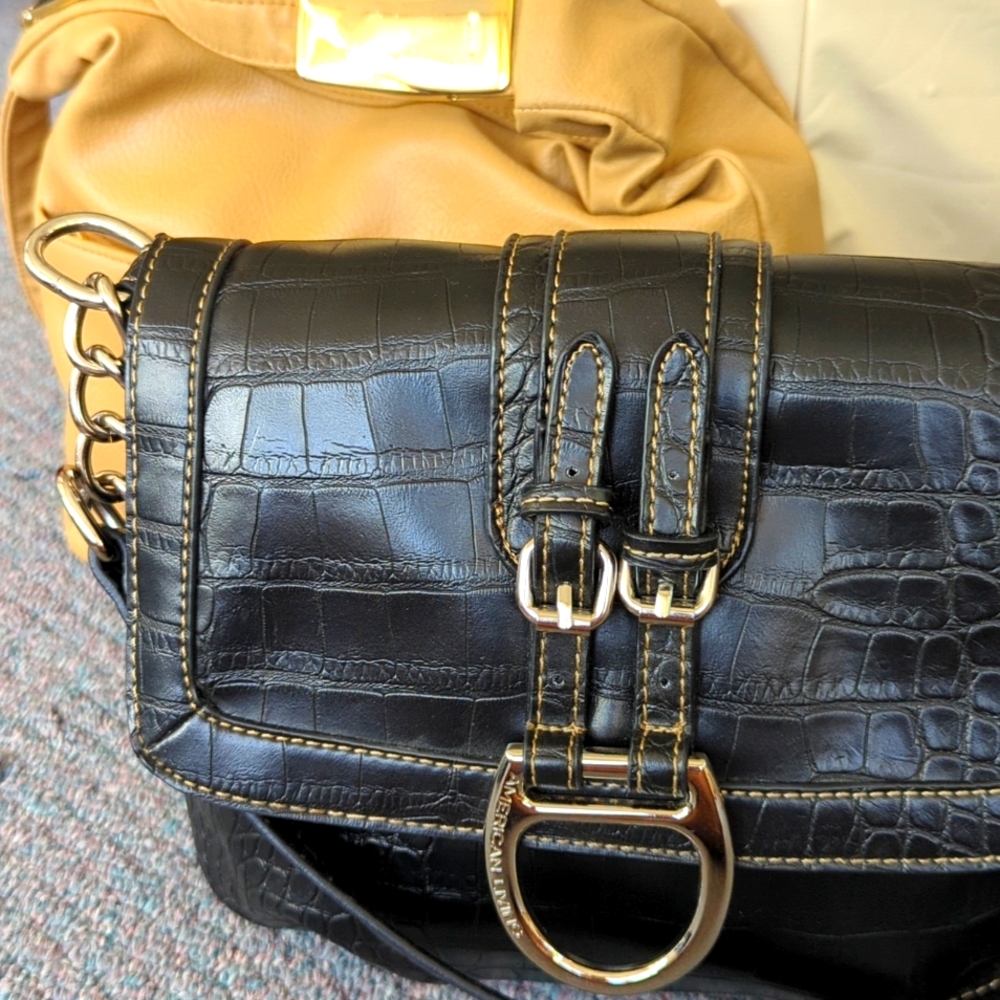 bundle of 2 neutral purses, black and tan. both have hardware, silver toned and gold toned. inside / outside compartments, zippered closure and flap closure one is made by American Living ( black), the other is unbranded (tan)