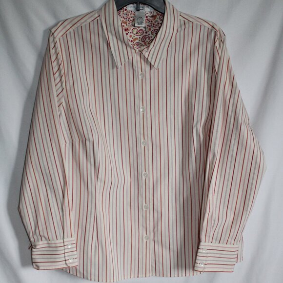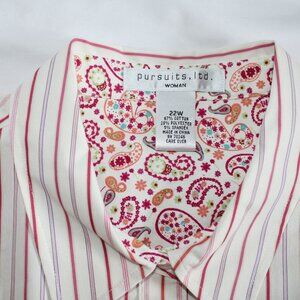 Crafted for versatility and style, the Pursuits LTD women's button-up shirt is a splendid addition to your wardrobe. Its striking pink, cream, and raspberry striped pattern ensures you stand out in any setting, be it business or casual. The long sleeves with reversible/double-sided cuffs offer a tailored look that can adapt to your preference. This shirt combines the comfort of cotton, the stretch of spandex, and the durability of polyester, ensuring a comfortable fit for size 22W. Designed with easy care in mind, it maintains a crisp appearance with minimal maintenance. Suitable for all seasons, this piece is a practical yet fashionable choice for any time of year.