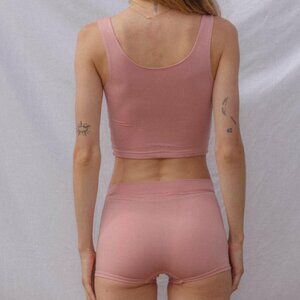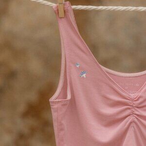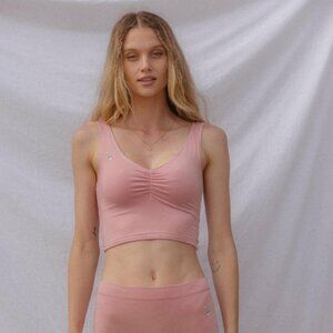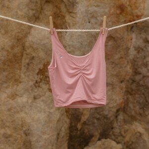 Beautiful rose pink cropped double layer bra top. Incredibly supportive and comfortable, made from tencel lyocell and spandex. Features a cute blue mushroom detail.