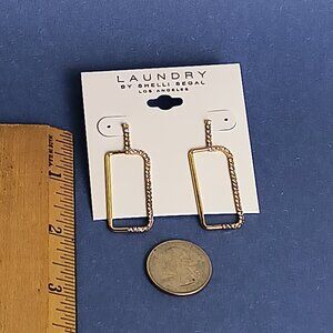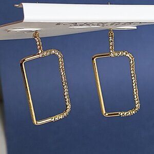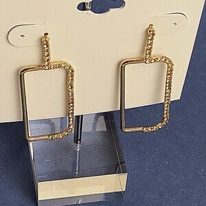 Push Back Rectangular Framed Dangle Earrings Rhinestone Gold Tone Lightweight