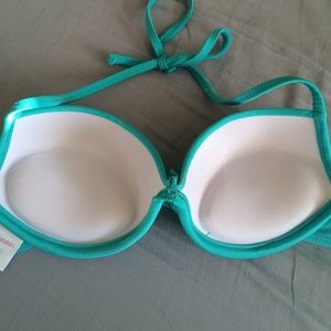 Teal push up, halter swim top. With a twist in the middle. Worn a couple times to tan outside but has never been submerged in water.