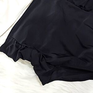 This black & ivory tankini set features a sweetheart neckline, flowy ruffled cups, and high-waisted ruched bottoms with tummy control.