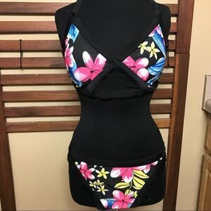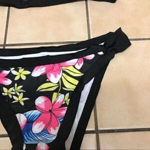 Beautiful black bathing suit with yellow, pink and blue flowers. Has a mesh detailing in the top and a high bikini bottom. Straps are not adjustable. Brand new. Polyester. Please refer to measurements S- Bust: 26.77"-30.71 Waist: 26.77"-32.28" L- Bust: 29.92"-33.86" Waist: 29.92"- 35.43" XL- Bust: 31.50"-35.43" Waist: 31.50"- 37.01"