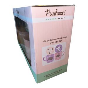 Pusheen The Cat Set of Stackable Ceramic Mugs with Coasters Gift Set Pink Green