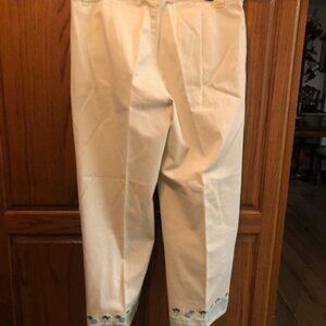 These pedal pushers by Pusser's West Indies Caribbean are a stylish and comfortable addition to any woman's wardrobe. The size 10 pants feature embroidered tropical coconuts, adding a fun and unique touch to the beige cotton/spandex blend material. With a regular fit and straight leg style, these pants are perfect for everyday wear and can easily be dressed up or down for any occasion. The flat front design gives them a clean and polished look, making them a versatile and eye-catching option for any fashion-conscious woman. Tropical palm tress and shells embroidered at the bottom of the beige colored wide bottom pedal pusher pants. Great for vacation!