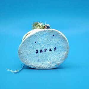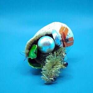 Vintage Putz Santa Boot Ornament features a charming bottle brush tree and mercury glass beads from 1950s Japan. A delightful addition to holiday decor, perfect for collectors and enthusiasts.