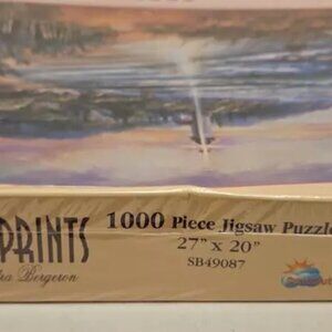 This 1000-piece jigsaw puzzle titled "Footprints" #SB49087 by Sandra Bergeron showcases a captivating sunset seascape with a lighthouse. The puzzle measures 27" x 20" and offers a challenging yet rewarding experience for puzzle enthusiasts, enhancing both concentration and relaxation.