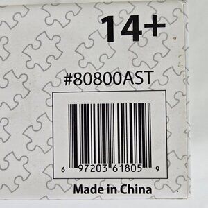 1000 piece jigsaw puzzle titled "Historic Alley" gives a view of a cobblestone street with flower accented homes. Marked as not a toy due to small pieces. Recommended ages 14+.