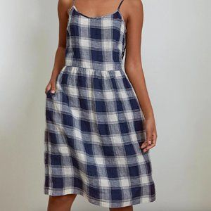 Brighton Plaid is a navy blue & off white plaid in a light/medium weight, pre-shrunk, 100% European flax linen. Features of the Model No. 34 dress include: