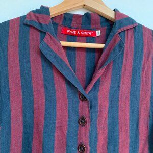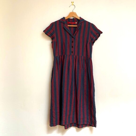 Collared, button up, v-neckline vintage inspired shirtdress. Adjustable waist tie. Corozo nut buttons. Side pockets