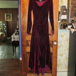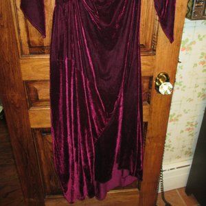 Burgundy Velvet Floor Length Gown, Cowl Neck Drape Front, V Point Sleeves, Front Faux Wrap, Side Zipper, Back Godet Sweeps the Floor, 55" Front Side Drape at Shortest Point, 62" Longest Point in Back, Never Worn