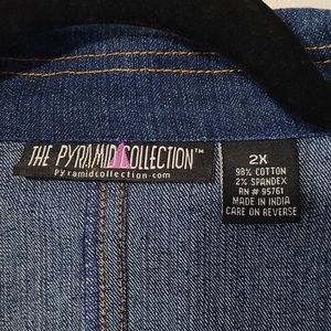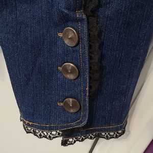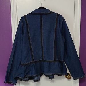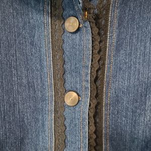 Like new smoke free pet free home. Cute as it can be jean jacket with black lace and trim. Ruffle sleeves. Shoulder to hem app 27". Sleeves also app 27" see all pictures. Any questions ask.