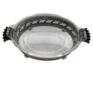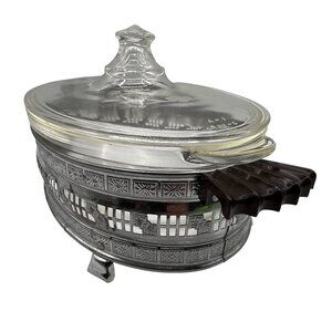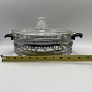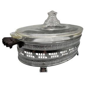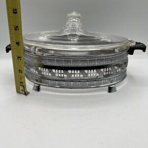 Pyrex 1.5qt Vintage Oval Glass Casserole Dish Etched Silver Plated Footed Holder