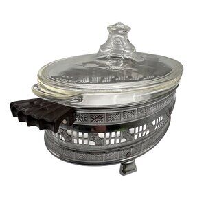 This Pyrex casserole dish combines timeless elegance with practical functionality. It's perfect for serving and keeping food warm, thanks to its silver-plated holder. The clear glass allows you to easily monitor cooking progress, while the intricate design adds a touch of sophistication to your table setting.