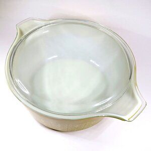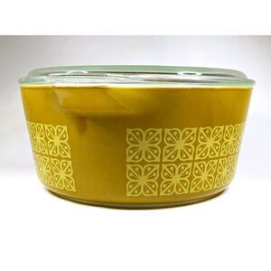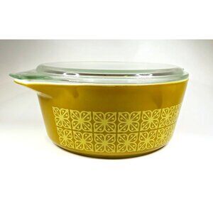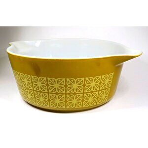Produced in the late 1960s as part of Pyrex’s promotional Autumn Floral line—also known among collectors as the Square Flowers pattern—this 475-B 2½ quart round casserole features golden floral motifs arranged in a stylized grid over a rich olive-green base.