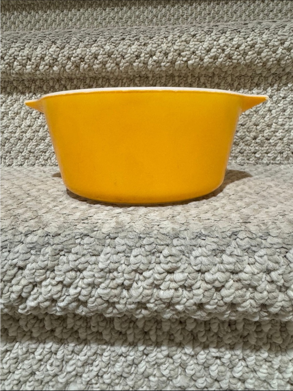 Vibrant orange pyrex serving bowl with small pouring spouts. Smooth, glossy finish. Simple, classic shape for everyday use.