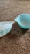 Set of Pyrex mixing bowls. Aqua exterior with white interior. Perfect for baking and serving.