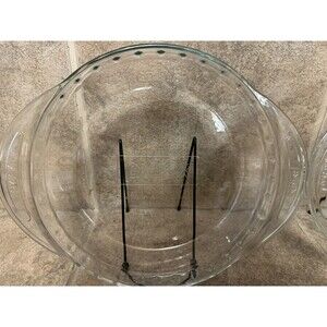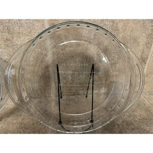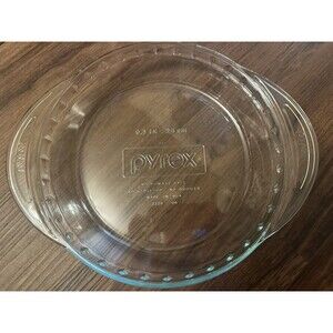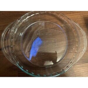 The Pyrex Clear 9.5 Inch Deep Dish Pie Plate is a vintage and original piece from the late 20th century, featuring a fluted edge and handles for easy transportation. Made of clear glass with a vintage pattern, this pressed glass plate is machine washable up to 100°F and weighs 2 lbs. With a round shape and a size of 9.5 inches, this Pyrex plate is perfect for all occasions and adds a touch of nostalgia to any kitchen setting.