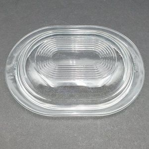 Pyrex Clear Glass Oval Refrigerator Dish with Ribbed Lid. Both pieces are in good vintage condition. There is scratch on the inside bottom of the dish and also on the lid but there are no chips or cracks. The dish is 700ml, just shy of 24 ounces, #602-B measuring 8' x 6" edge to edge and 1.75" deep without the lid. The ribbed cover is #602-C.