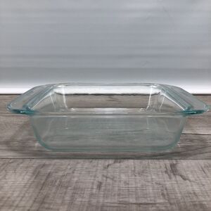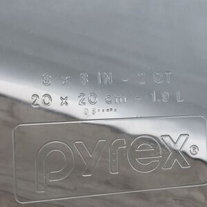 The Pyrex Clear Square Baking Dish Casserole is a vintage American-made casserole dish with a 2 Qt capacity, perfect for baking brownies or any other dishes. Made of pressed glass with a glossy finish, this oven-safe, microwave-safe, and dishwasher-safe dish features a solid clear color and measures 8" x 8" x 2". The Pyrex brand is known for its quality and durability, making this baking dish a reliable and charming addition to any kitchen.