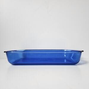Pyrex Cobalt Blue Glass 2 Qt 2L Casserole Baking Dish Cake Pan Wicker Basket USA. Pre-owned, good condition. Measures approximately 11" long by 7" wide by 1" deep. Please see pictures and contact me with questions.