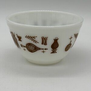 This Pyrex mixing bowl, part of the Early American collection, showcases vintage charm with its distinctive brown pattern on milk glass. A collector's delight, it marries function with nostalgic design, capturing the essence of mid-century kitchenware. Substantial yet delicately crafted, it's an ideal addition to both culinary and decorative displays.