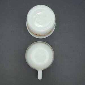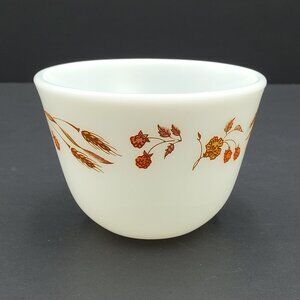 Pyrex "Harvest Home" Open Sugar Bowl and Coffee Cup. Excellent pre-owned condition. The sugar bowl is 4" wide x 2.5" tall and the cup is 3.75" wide x 2.75" tall. Nice replacement pieces for your Harvest Home collection.