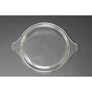 The Pyrex Homestead Baking Dish is a two-piece round baking dish set made of glass in a cream color. With a capacity of 1 L, this casserole baking dish is ideal for baking and serving dishes. This measures approx. 7.5" wide including the handles with 6" diameter and 3.25" height. The bowl does have a few small marks. Comes with a clear glass lid numbered 470-C which has some scratches and a small chip on the edge of one handle.