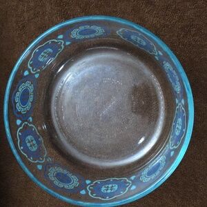 Vintage Pyrex clear glass mixing bowl, (dish # 7203, 7 inches round X 3 1/4 deep), with a blue turquoise