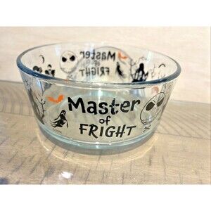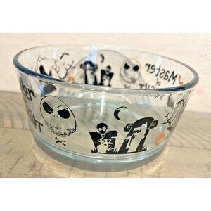 The Pyrex Nightmare Before Christmas Halloween Glass Food Storage Bowl set includes 5 round glass bowls featuring a clear color with a Disney-themed pattern inspired by The Nightmare Before Christmas. Perfect for storing food during the Halloween or Christmas seasons, these original bowls from the 21st century add a touch of festive charm to your kitchen. Made of durable glass, this product set is a delightful addition to any fan of the Disney movie franchise.