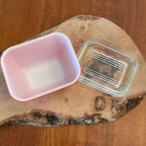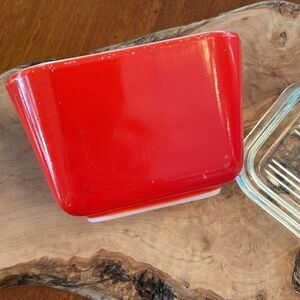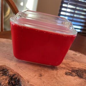 EUC Pyrex Red Refrigerator Dish with Ribbed Lid. Approximate Measurements: 4" x 3"