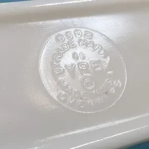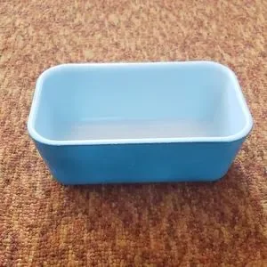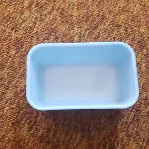 Blue, rectangle, milk glass. Measures 6.5 inches x 4 inches. Marked at the back bottom --> 0502 oven safe, 40, made in USA.