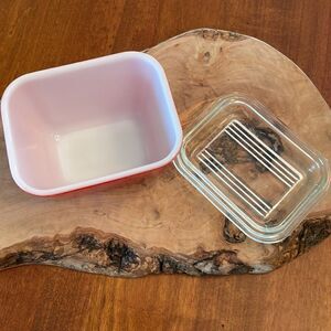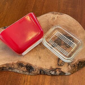 EUC Pyrex Red Refrigerator Dish with Ribbed Lid. Approximate Measurements: 4" x 3"