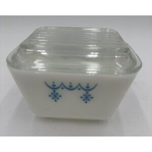 This vintage Pyrex refrigerator dish features the Snowflake Garland design in blue on durable milk glass. The clear, ribbed lid complements its mid-century charm, making it a functional and collectible piece for kitchen storage or display.
