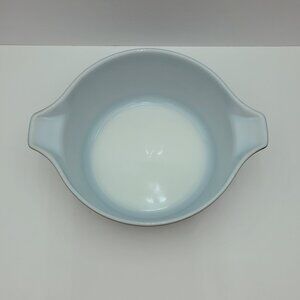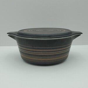 Pyrex Terra 2.5 Quart Round Covered Casserole Dish Lidded Baker. Very good vintage condition. The inside is clean and white. The outside has a matte finish so you'll see some scuffs and wear to the pattern, but no chips or cracks, and some scratch on the lid. This MCM pattern (also known as Brown Lines, Terra Cotta, Brown Terra or Earth) is dark chocolate brown with a charcoal black overspray and grooved or "scratched" orange brown stripes. 2-1/2 quarts, 8.75" round, 10.75" handle to handle, 3.75" deep without the lid.
