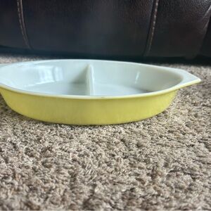 Pyrex Verde 474 and 1 1/2 qt divided dish. Dishes are in good condition. No chips or cracks. Some flea bites. Shown in pictures.