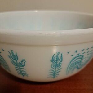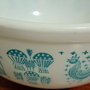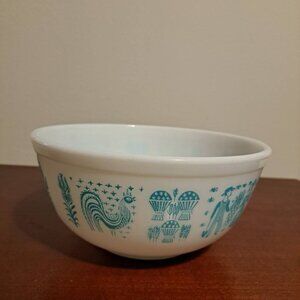 Pyrex Vintage 403 Amish Butterprint 2 1/2 Quart Round Mixing Bowl. White with turquoise decal. Condition: The bowl has wear, scuffs, flea bites on the rim and interior scratches. No cracks or chips.