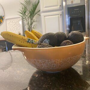 1960s Pyrex Bowls in the Woodland Brown pattern. This is a discontinued pattern and this style cinderella mixing bowl has the pour handles which are great for cooking and baking. microwave and dishwasher safe. They are not oven or broiler safe.