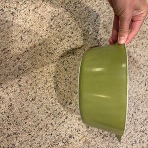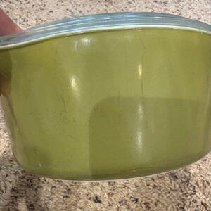 Pyrex Vintage avocado green casserole dish with lid. some scratches from wear. 4 inch X 8.5 inch