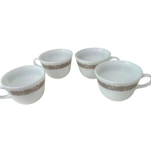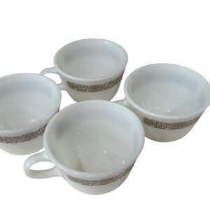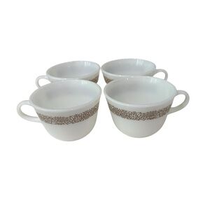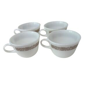 Pyrex Woodland Brown 4 Milk Glass Coffee Mugs 1978- 1983 Vintage Kitschy Collectible. Great condition. Microwaveable safe. No chips, cracks or dings to any of the coffee cups.