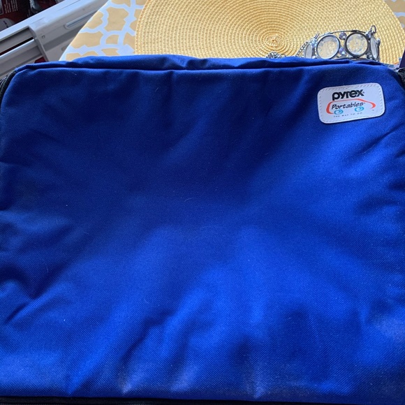 4 piece Corning/Corning portables. Has 3 qt glass rectangular deep baking dish, blue cover, blue traveling case with 2 Velcro closure handles & hot/cold pack.