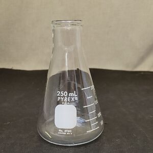 Set of three Pyrex glass flasks. Clear with measurement markings. 2 of these are 250ml No. 4980 stopper no.6. The smaller one is Tekk 125ml No. 26500. Stopper no.5. There are no chips or cracks in them.