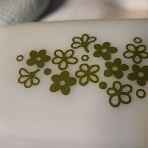 This butter dish measures 7" x 3". The Pyrex logo is imprinted on the bottom with # 41. This butter dish is in beautiful condition, with no chips, cracks or flaws. Looks brand new. Classic.