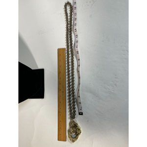 This is a fantastic necklace. It is about 39 inches around with about a three inch slice of Pyrite. It is not magnetic and the gold just shines though the beads and the charm. It is about 173 grams so it is a heavy one. There is no signature. The beads are not rough cut but not completely smooth either.