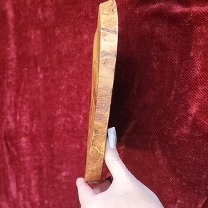 this beautiful girl with a deer was burned by hand on birch from a tree in my dad's yard. it was cut in weird angles, and it's VERY hard wood. all I have is a little sander, so it still has a bit of a bowl shape because even this much sanding took SO many hours. it's gorgeous wood, though, and can sit in a plate display stand.